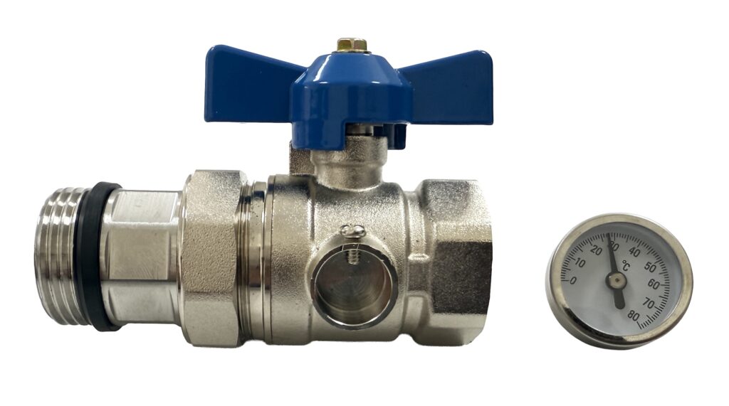 Termometreli Küresel Vana, ısıtma sistemlerinde akış kontrolü ve anlık sıcaklık izlemeyi tek üründe birleştiren pratik bir tesisat elemanıdır. Pirinç gövde ve nikel kaplama yüzeyi ile korozyona karşı üstün dayanıklılık sunarken, entegre 0-80°C termometresi sayesinde hattaki su sıcaklığını ek ekipmana gerek kalmadan görsel olarak takip etme imkânı sağlar. Kelebek kollu tasarımı kolay açma-kapama kontrolü, rakorlu bağlantısı ise kollektör gruplarına hızlı ve sızdırmaz montaj kolaylığı sunar.